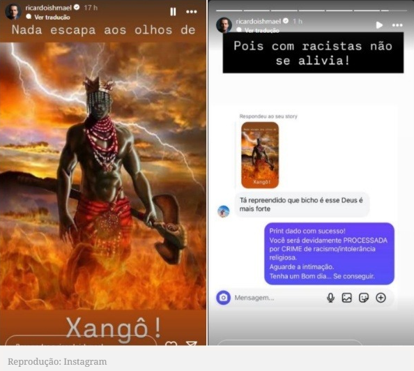 O apresentador da TV Bahia, Ricardo Ishmael, utilizou as redes sociais nesta sexta-feira (12), para denunciar um caso de intolerância religiosa. O jornalista compartilhou uma mensagem que recebeu de uma seguidora em uma publicação em que aparecia a imagem de Xangô, orixá do candomblé, e uma frase referente a foto, “Nada escapa aos olhos de Xangô!”.