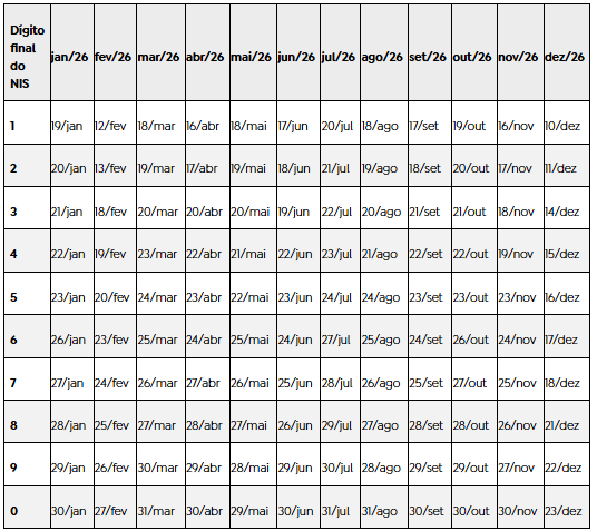 Os pagamentos vão acontecer nos últimos dez dias úteis de cada mês, de forma escalonada conforme o dígito final do Número de Inscrição Social (NIS), exceto em dezembro, quando o cronograma é antecipado em cerca de uma semana por causa do Natal.