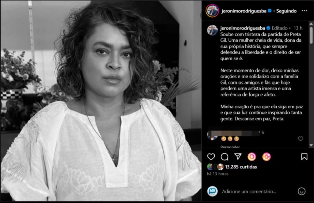 Jerônimo por sua vez, prestou solidariedade aos familiares da famosa e aos fãs, também por meio do seu perfil do Instagram. “Soube com tristeza da partida de Preta Gil. Uma mulher cheia de vida, dona da sua própria história, que sempre defendeu a liberdade e o direito de ser quem se é”, iniciou.