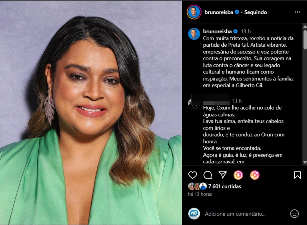 O prefeito da capital baiana Bruno Reis usou seu perfil do instagram para lamentar a morte de Preta e destacar a importância da própria para a cultura brasileira. “Recebo com muita tristeza a notícia do falecimento de Preta Gil, artista multifacetada, empresária e voz ativa na luta contra os diversos tipos de preconceito. Filha de Gilberto Gil, Preta construiu um belo legado na cena cultural brasileira, com sua presença vibrante nos palcos, além da bem-sucedida carreira empresarial”, escreveu.