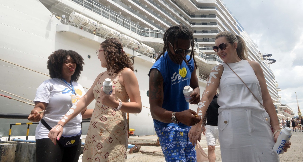Com um grupo de 20 pessoas, entre amigos e familiares, a biomédica Janaína Letícia Lins, 27 anos, elogiou a recepção e revelou estar bastante ansiosa para conhecer o Centro Histórico. Pela primeira vez na cidade, a turista fez questão de decorar os braços com uma pintura tribal oferecida por dois pintores, responsáveis por realizar desenhos corporais artísticos nos visitantes que desembarcam do cruzeiro.