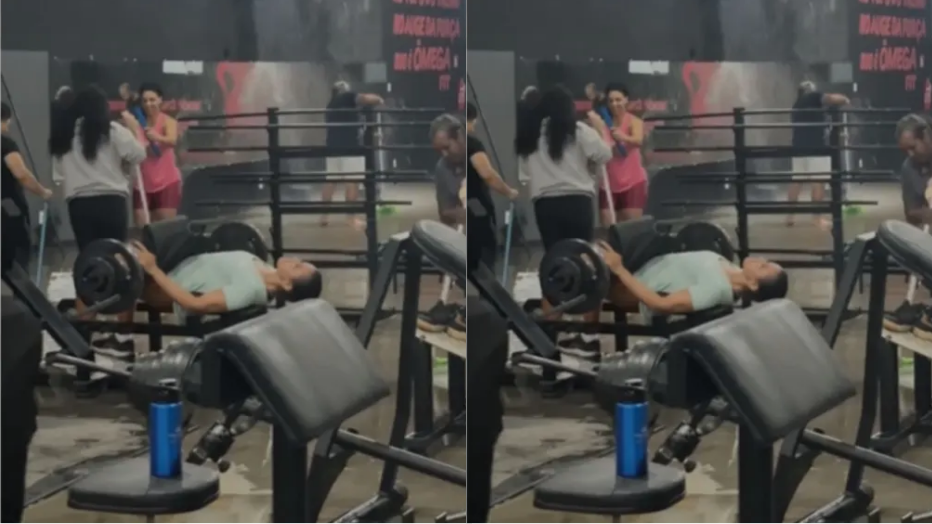 As imagens foram divulgadas nas redes sociais da academia e mostram a água se espalhando pelo estabelecimento enquanto a mulher continua a realizar os exercícios. Alunos e funcionários do lugar se mobilizaram para tentar amenizar a situação.