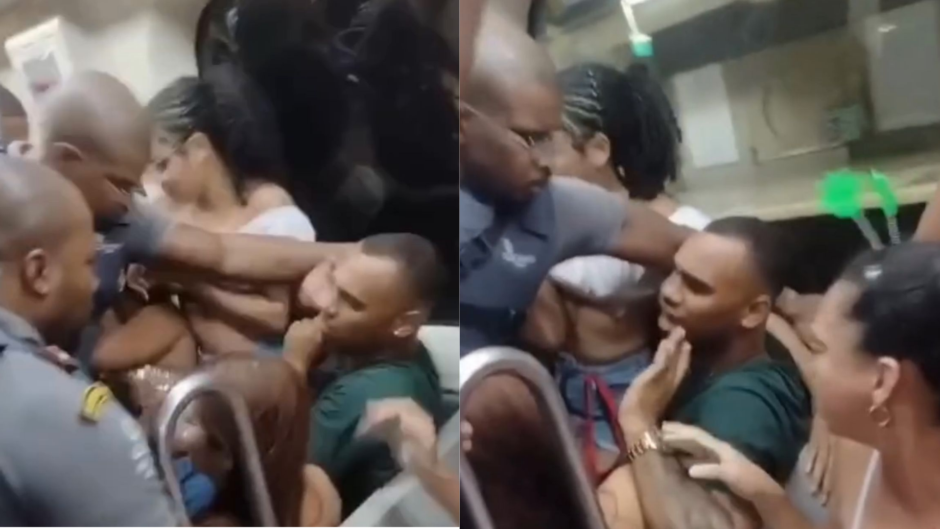 Um homem com camisa verde aparece sentado, enquanto duas mulheres disputam o mesmo assento, em cima dele. Seguranças da CCR Metrô tentam intervir para conter a situação e encerrar a confusão.