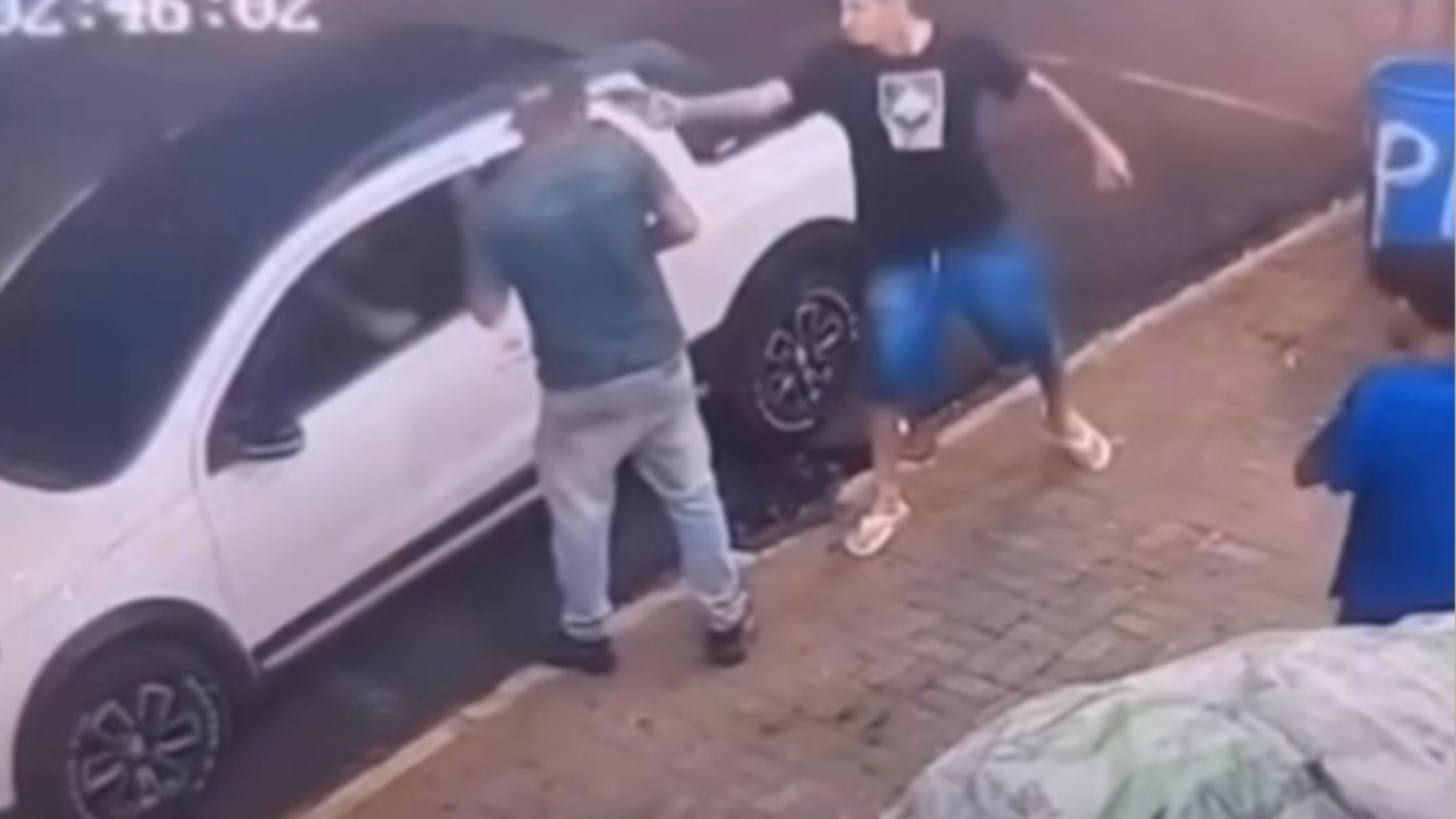 Imagem que circula na internet, mostra o momento em que o suspeito chega ao local e atira na cabeça da vítima. Segundo a polícia, foram mais de cinco disparos.