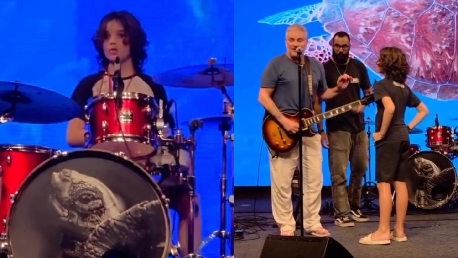 O filho de Manno Góes, Zeca, roubou a cena ao mostrar seu talento na bateria durante participação especial da banda Monarka em evento do Projeto Tamar, neste sábado (4), na Praia do Forte. Ao lado do pai no palco, Zeca surpreendeu os fãs e ao que parece segue os mesmos passos do artista.
