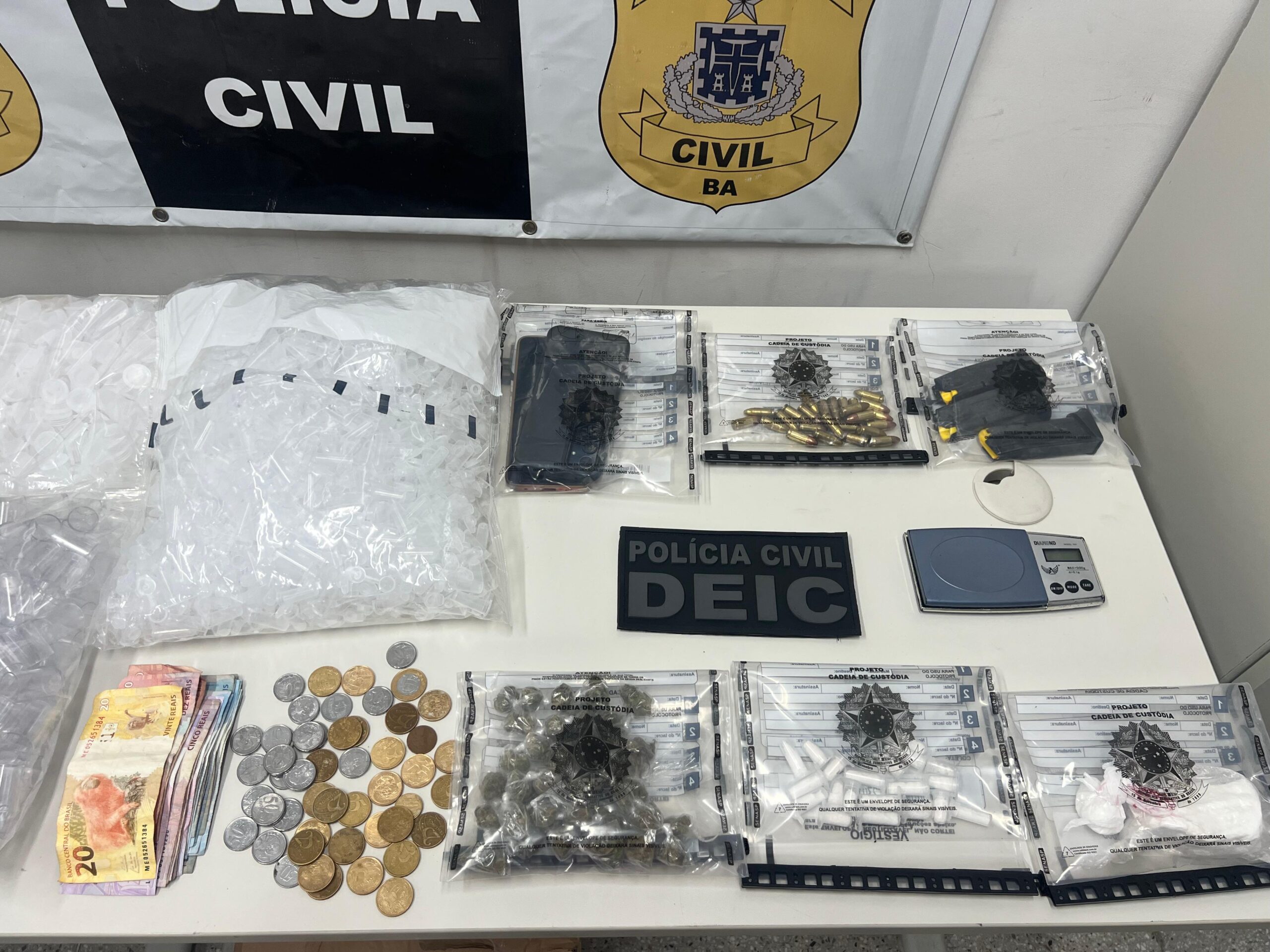 A Polícia Civil da Bahia, por meio do Departamento Especializado de Investigações Criminais (DEIC), através da Delegacia de Repressão a Furtos e Roubos (DRFR) com atribuição em Salvador, prendeu em flagrante, nesta sexta-feira (24), um homem pelos crimes de tráfico de drogas e porte ilegal de acessório e munição de uso restrito, no bairro do Garcia, em Salvador.