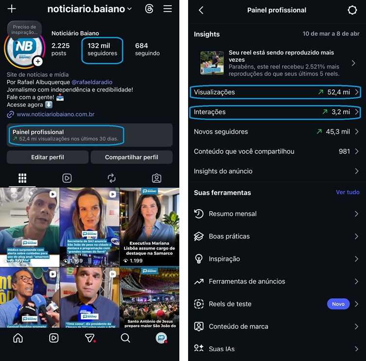 Prezando pelo jornalismo com independência e credibilidade, o Instagram do Noticiário Baiano, que atualmente conta com mais de 132 mil seguidores, bateu um importante recorde. O engajamento do perfil do NB (@noticiario.baiano) em 30 dias atingiu o pico de 52 milhões de visualizações. No período, foram mais de 3,2 milhões de interações do público, entre curtidas, comentários e compartilhamentos.