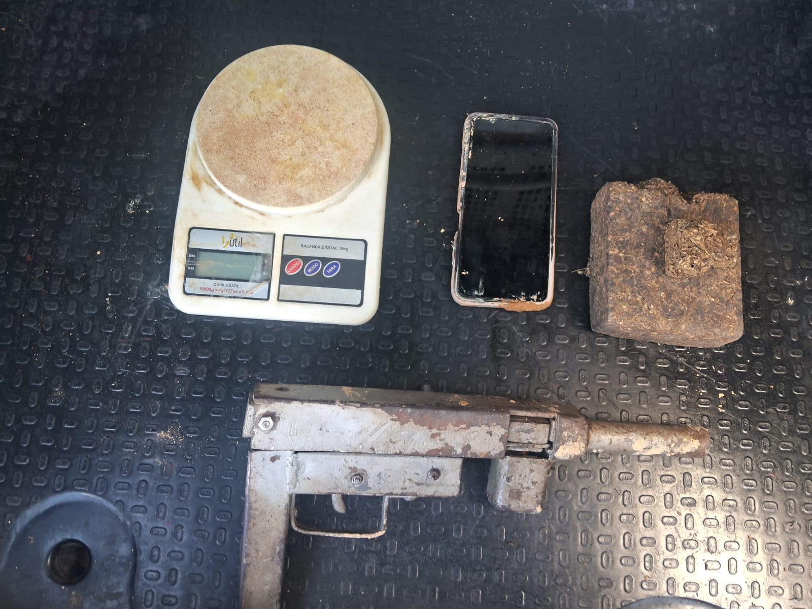 De acordo com a PM, a equipe recebeu uma denúncia de um homem que estava armado na localidade. Os policiais identificaram e abordaram um suspeito, e com ele foram encontrados o armamento, um tablete de maconha, uma balança e um aparelho celular.