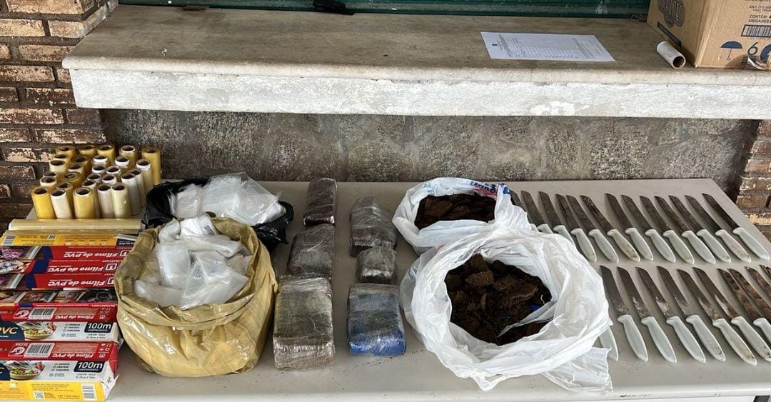 Policiais Militares apreenderam 6kg de maconha, 27 facas, uma balança de precisão e 2 mil embalagens comumente utilizadas no fracionamento e comercialização de entorpecentes no bairro de Tancredo Neves, em Salvador, nesta quarta-feira (8).