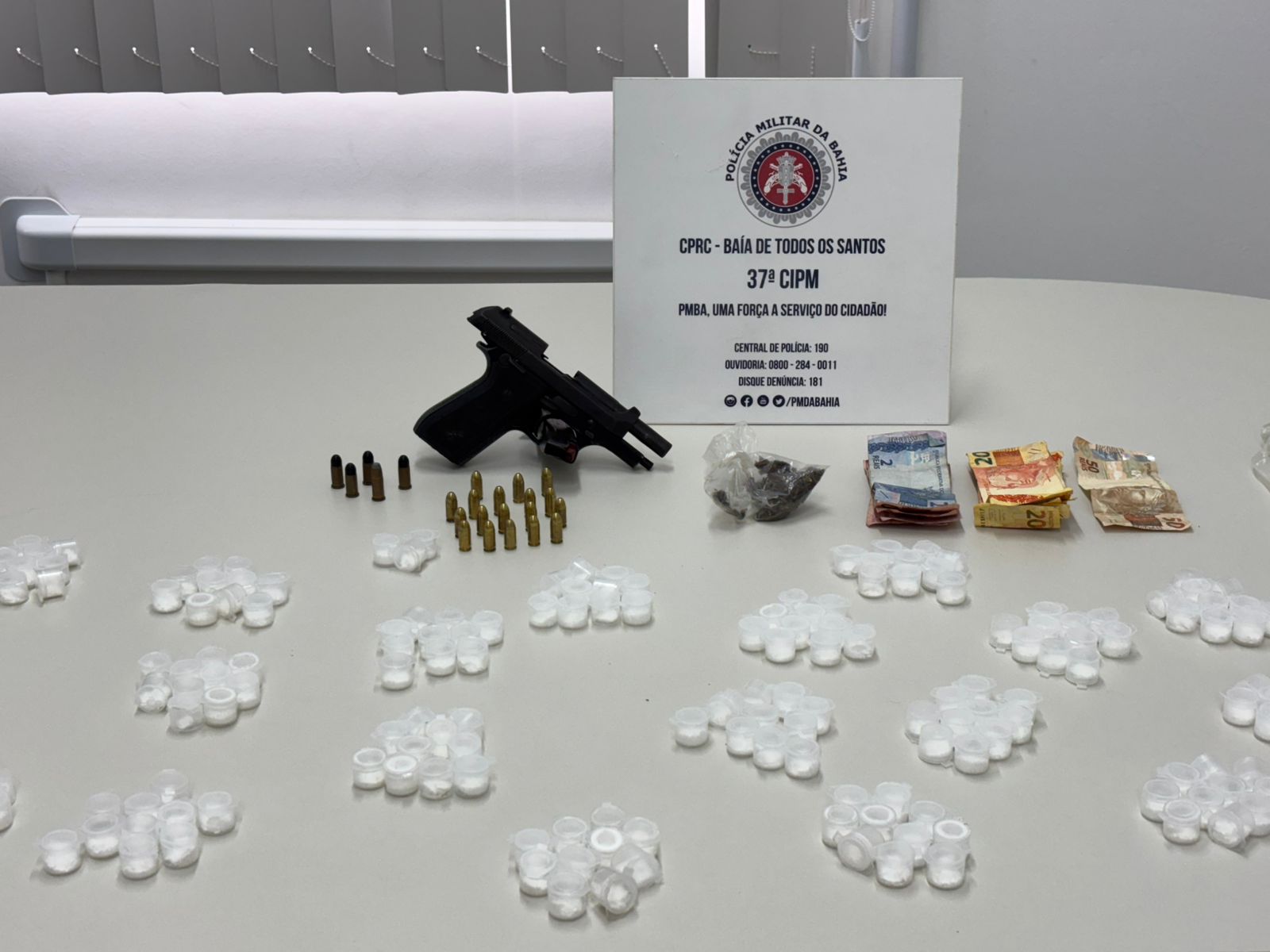Policiais Militares apreenderam uma mochila contendo uma pistola, munições, 233 porções de cocaína e um saco com maconha no bairro do Pau Miúdo, em Salvador, nesta segunda-feira (15),
