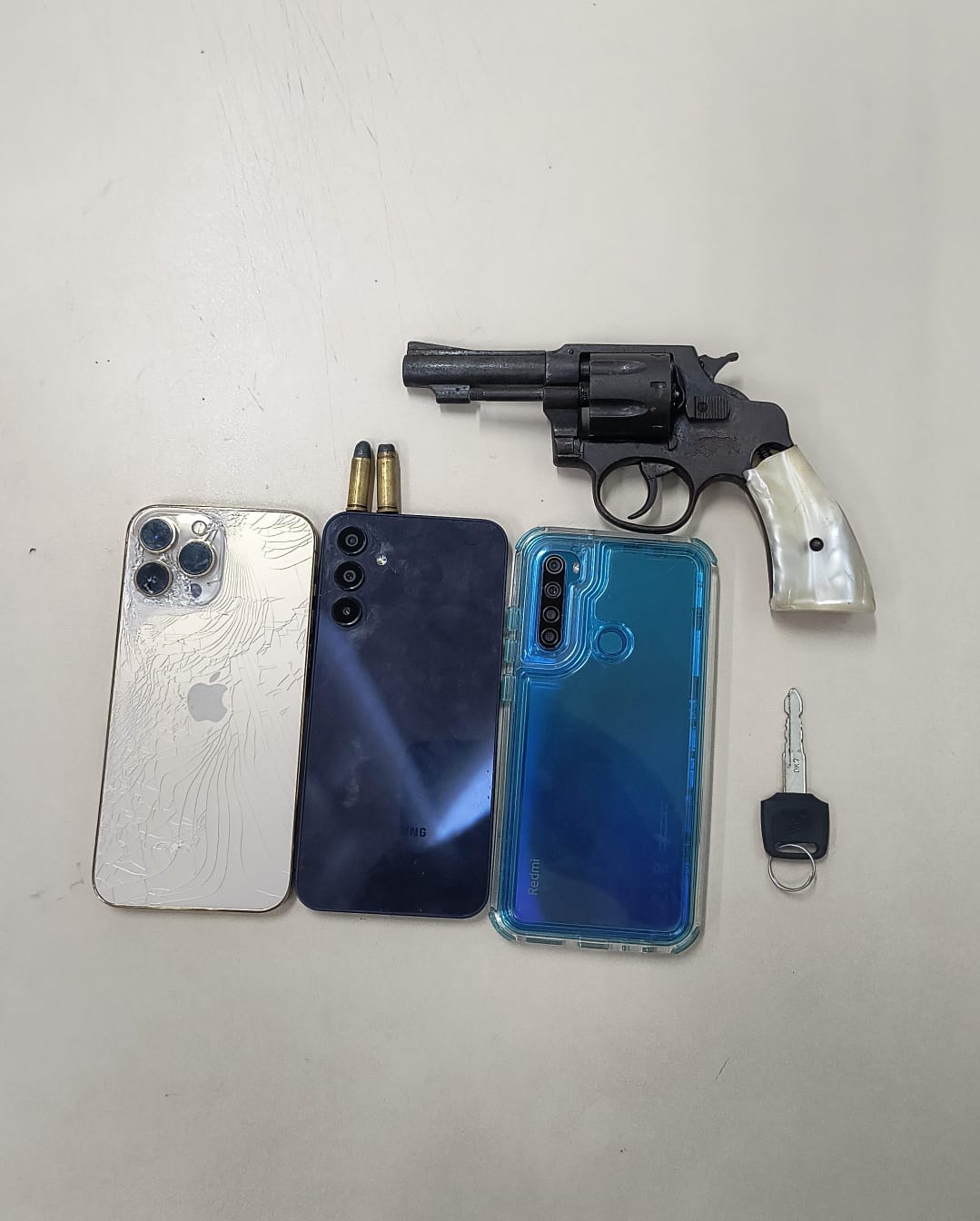 Segundo a PM, a equipe foi chamada por uma pessoa que relatou ter seu celular roubado por um indivíduo em uma moto. A guarnição localizou a motocicleta e realizou a abordagem. A moto que estava com o suspeito tem placa clonada. Com ele, os militares encontraram um revólver calibre .32 municiado, três aparelhos celulares e uma ferramenta metálica utilizada para estourar a ignição de motocicletas.