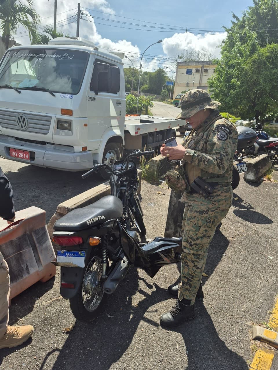 De acordo com a PM, as equipes transitavam pela localidade, quando avistaram uma moto com placa de identificação com sinais de adulteração. Durante a averiguação, foi constatado que se tratava de um veículo roubado.