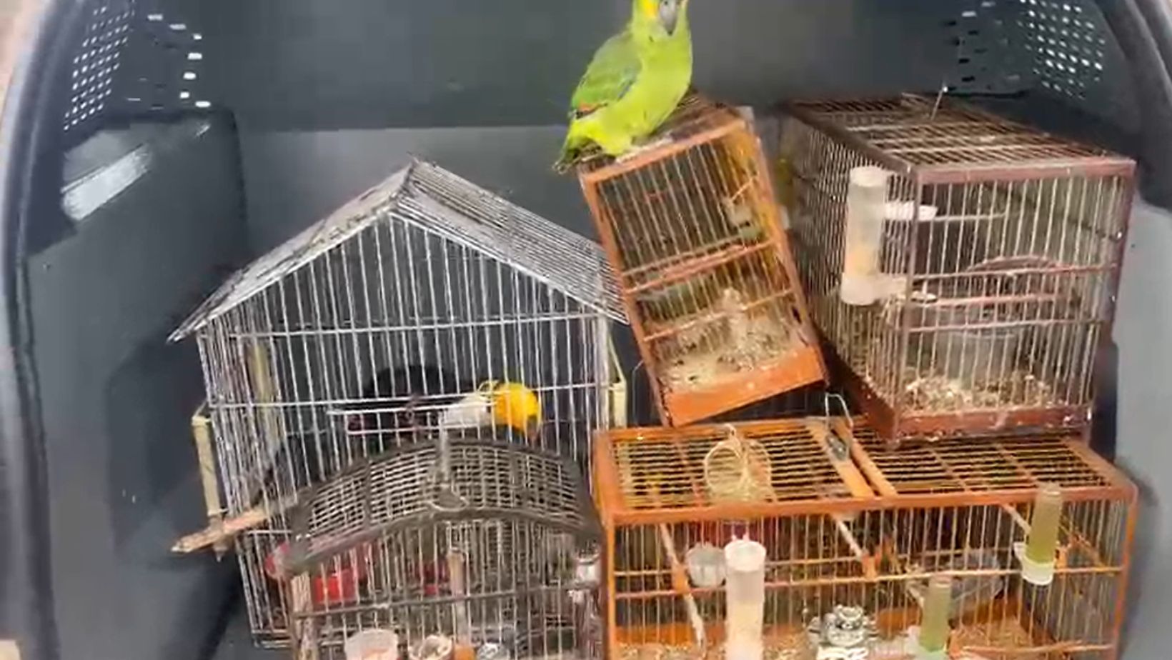 Os agentes faziam rondas na região quando foram acionados por meio de uma denúncia para conferir um suposto cativeiro de animais silvestres. Quando chegaram no local, foram encontrados um tucano, um papagaio, um coleirinho e um golinho em condições de maus tratos.
