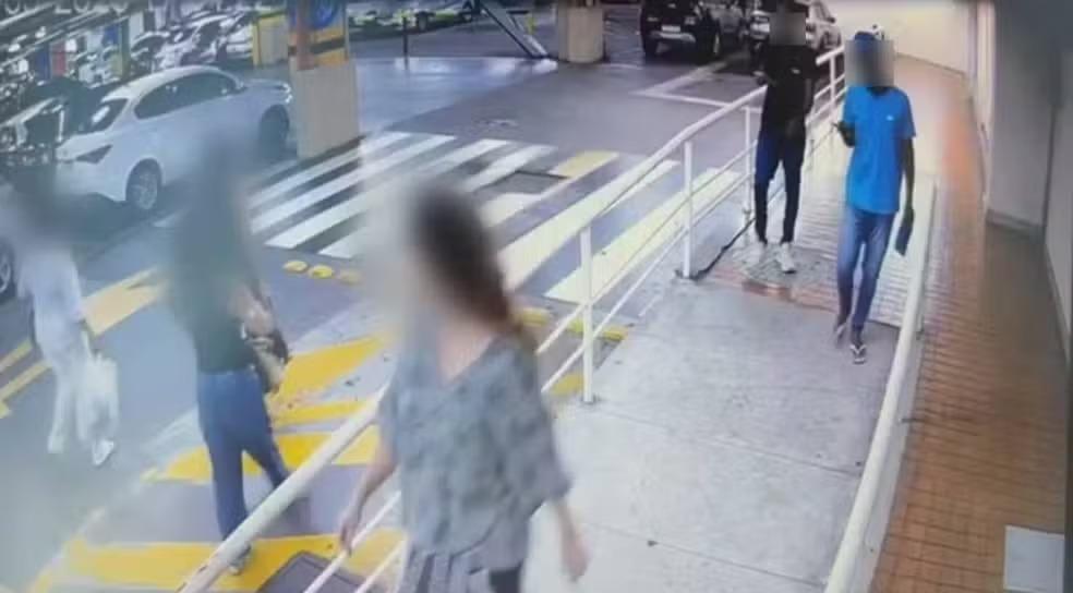 Na gravação, é possível observar as vítimas dentro do centro de compras, com os suspeitos nas proximidades do local.
