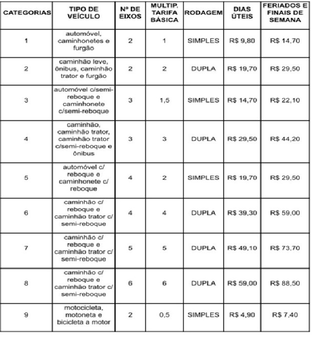 Dessa forma, os condutores terão que pagar mais caro para atravessar o pedágio. Carros de passeio, por exemplo, passarão a pagar R$9,80 em dias úteis, valor este que pode chegar a R$14,70 durante os fins de semana e feriados.