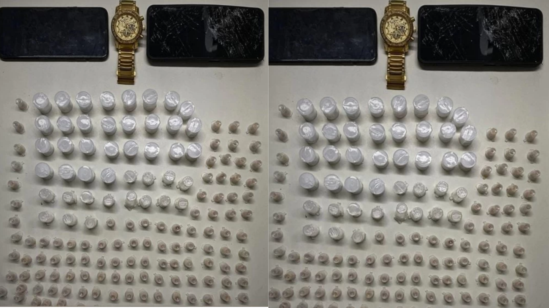 No percurso da varredura, um dos indivíduos foi identificado, alcançado e imediatamente preso. Com ele, foram apreendidos 117 pedras de crack e 43 frascos contendo cocaína.