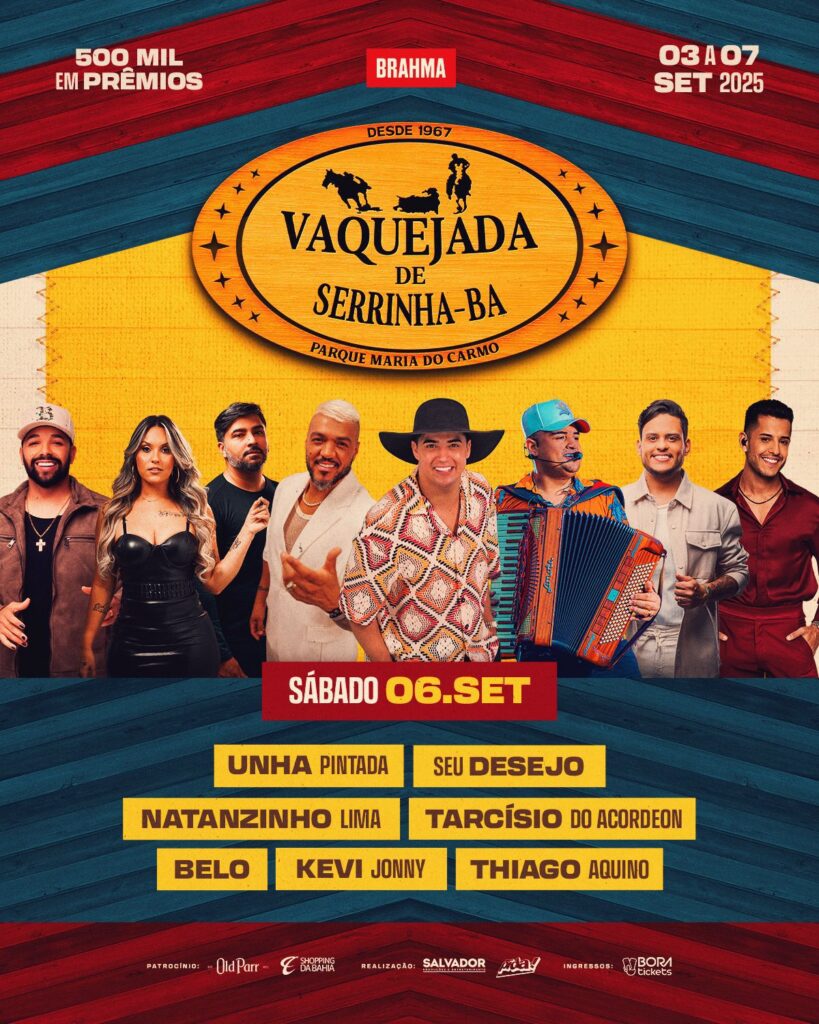 Na sexta-feira (5), a Vaquejada de Serrinha vai receber shows de Iguinho e Lulinha, Wesley Safadão, Rey Vaqueiro, Toque Dez, Nadson Ferinha, Klessinha e o GG Léo Santana. Já no sábado (6), segundo dia de festa, o palco da Vaquejada vai tremer ao som de Unha Pintada, Belo, Seu Desejo, Tarcísio do Acordeon, Kevi Jonny, Thiago Aquino e o irreverente Natanzinho Lima.