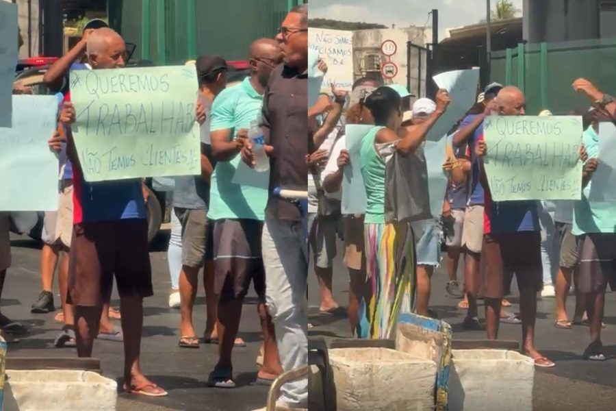 Em um registro que circula nas redes sociais, é possível observar ambulantes reunidos em frente ao terminal, segurando placas com a frase “queremos trabalhar”.