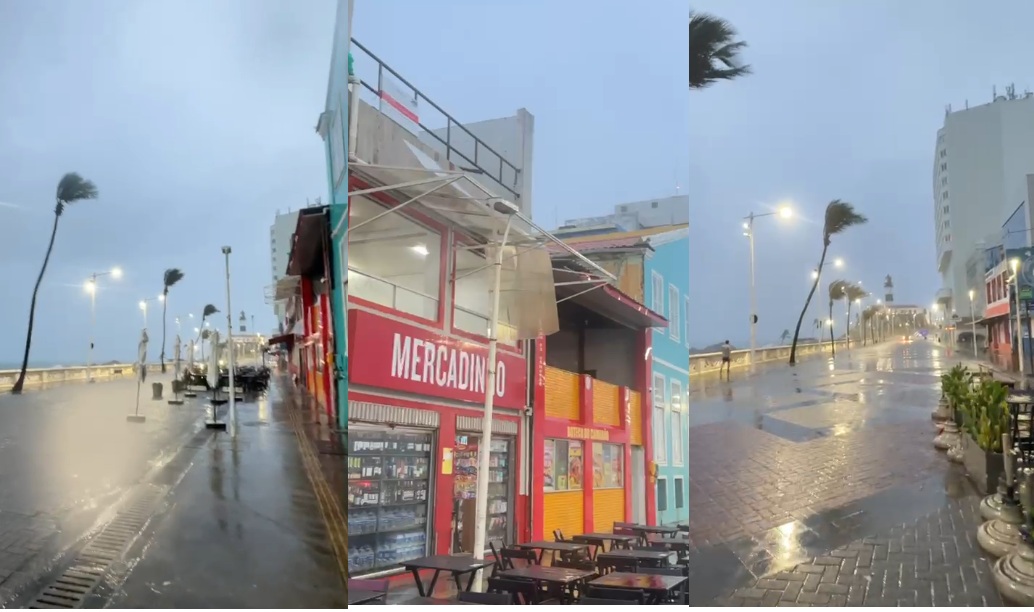 As fortes chuvas e ventos que atingem Salvador desde a madrugada da última segunda-feira (20) vêm causando diversos alagamentos e têm mudado completamente a rotina da cidade. Na região da Barra, uma das mais atingidas pelos ventos de até 60km/h, um estabelecimento comercial teve o seu telhado quase todo arrancado pela ventania. Como é possível ver nas imagens, o Mercadinho Aruba teve parte do teto de proteção frontal do estabelecimento arrancada pelo vento.