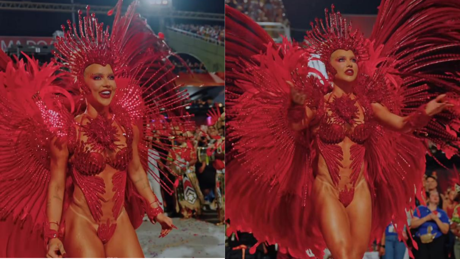O figurino da influenciadora chamou atenção pelo brilho, pela riqueza de detalhes e pelo tom vermelho, que se destacou na avenida e rendeu elogios do público e nas redes sociais.